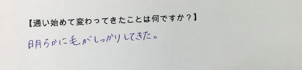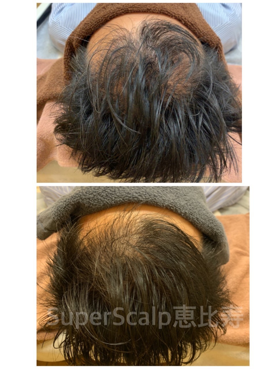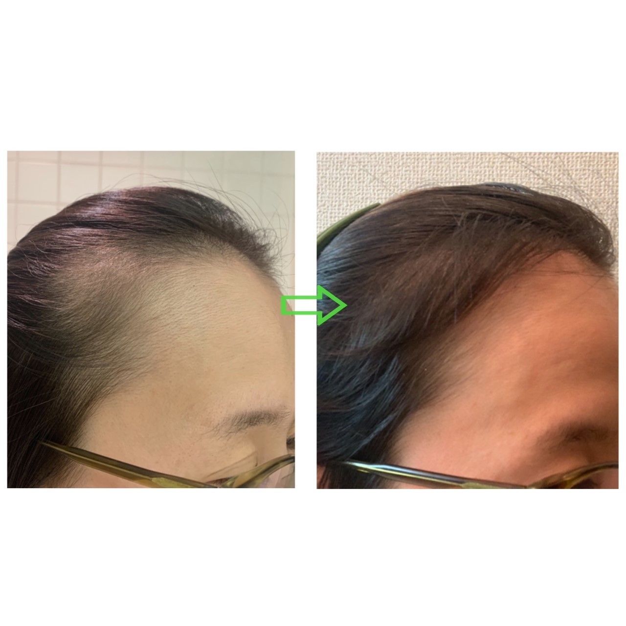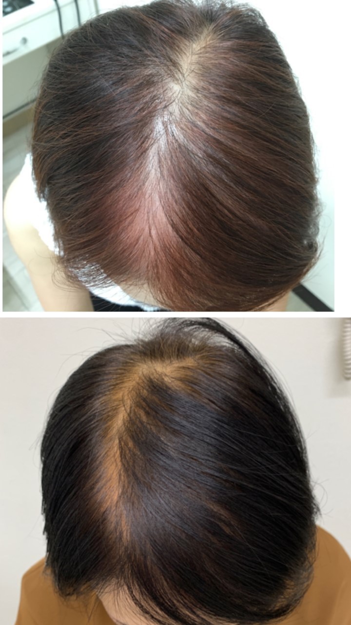 ホルモンバランスの乱れによりびまん性脱毛症気味だったお客様。多忙な毎日の中に育毛ケアのお手入れを頂き、大変だったかと思います。根気強く続けて下さった結果、抜け毛も減り髪にツヤが戻りました。ご主人様からも「髪質が太くなったね!」