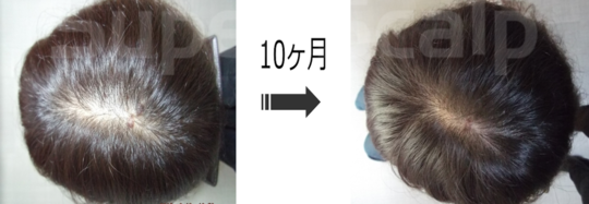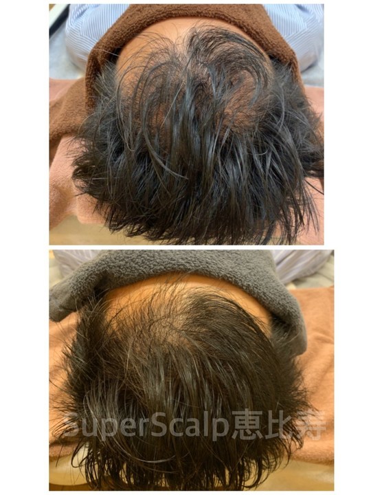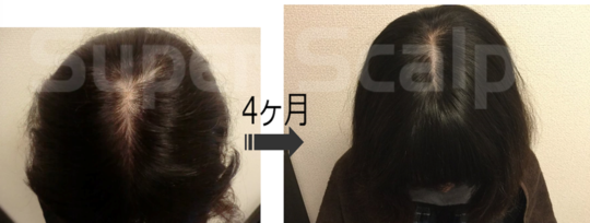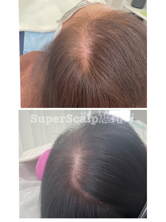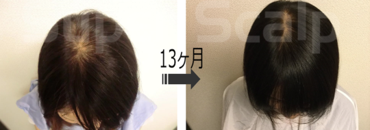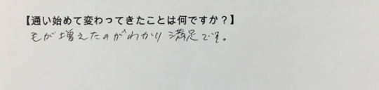 ホルモンバランスの乱れによりびまん性脱毛症気味だったお客様。多忙な毎日の中に育毛ケアのお手入れを頂き、大変だったかと思います。根気強く続けて下さった結果、抜け毛も減り髪にツヤが戻りました。ご主人様からも「髪質が太くなったね!」