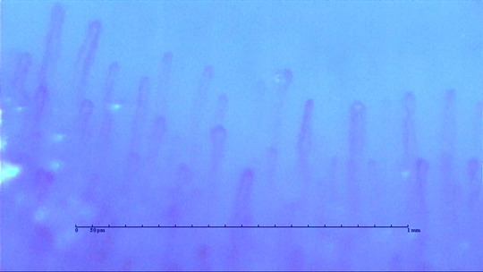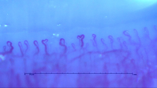 まっすぐに伸びたヘアピン状の毛細血管が規則正しく伸びている状態。もう少し毛細血管1本1本に太さがあれば、かなり正常で健康的な毛細血管と言えます。